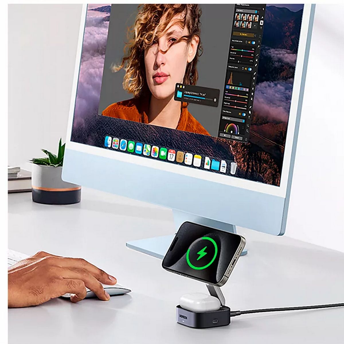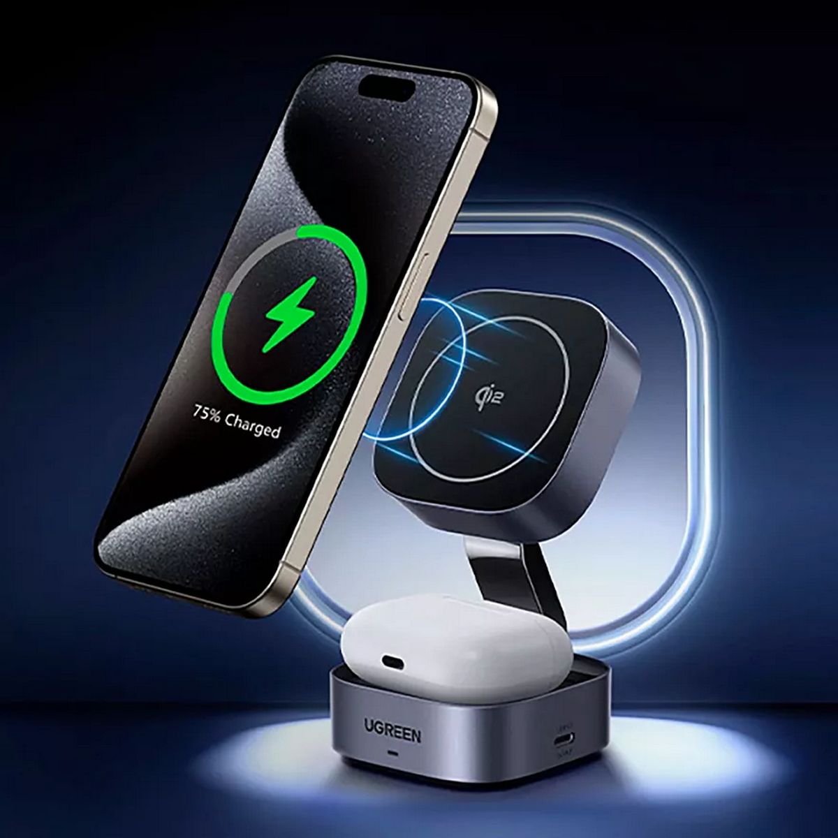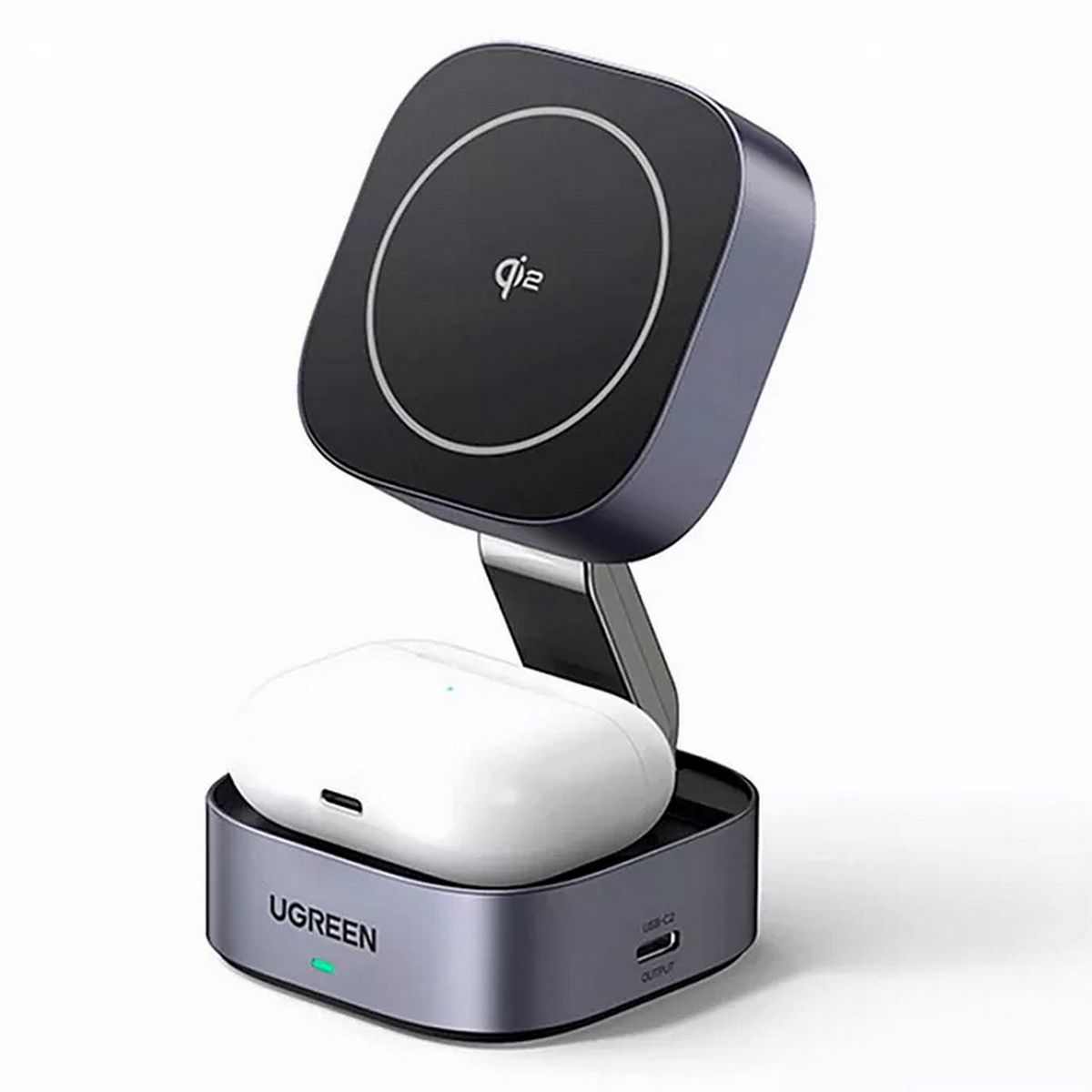 Зарядное устройство магнитное беспроводное 2-в-1 UGREEN W702 (35316) 2-in-1 Magnetic Wireless Charge for Iphone&AirPods 15W Qi2. Цвет: серый космос