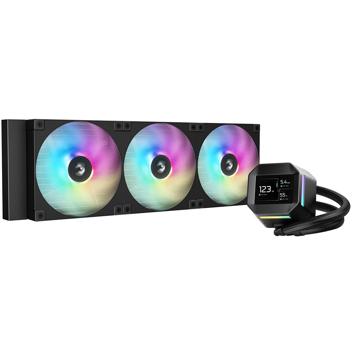 - Высокая эффективность охлаждения: радиатор длиной 420 мм и три вентилятора диаметром 140 мм обеспечивают быстрое и равномерное рассеивание тепла.